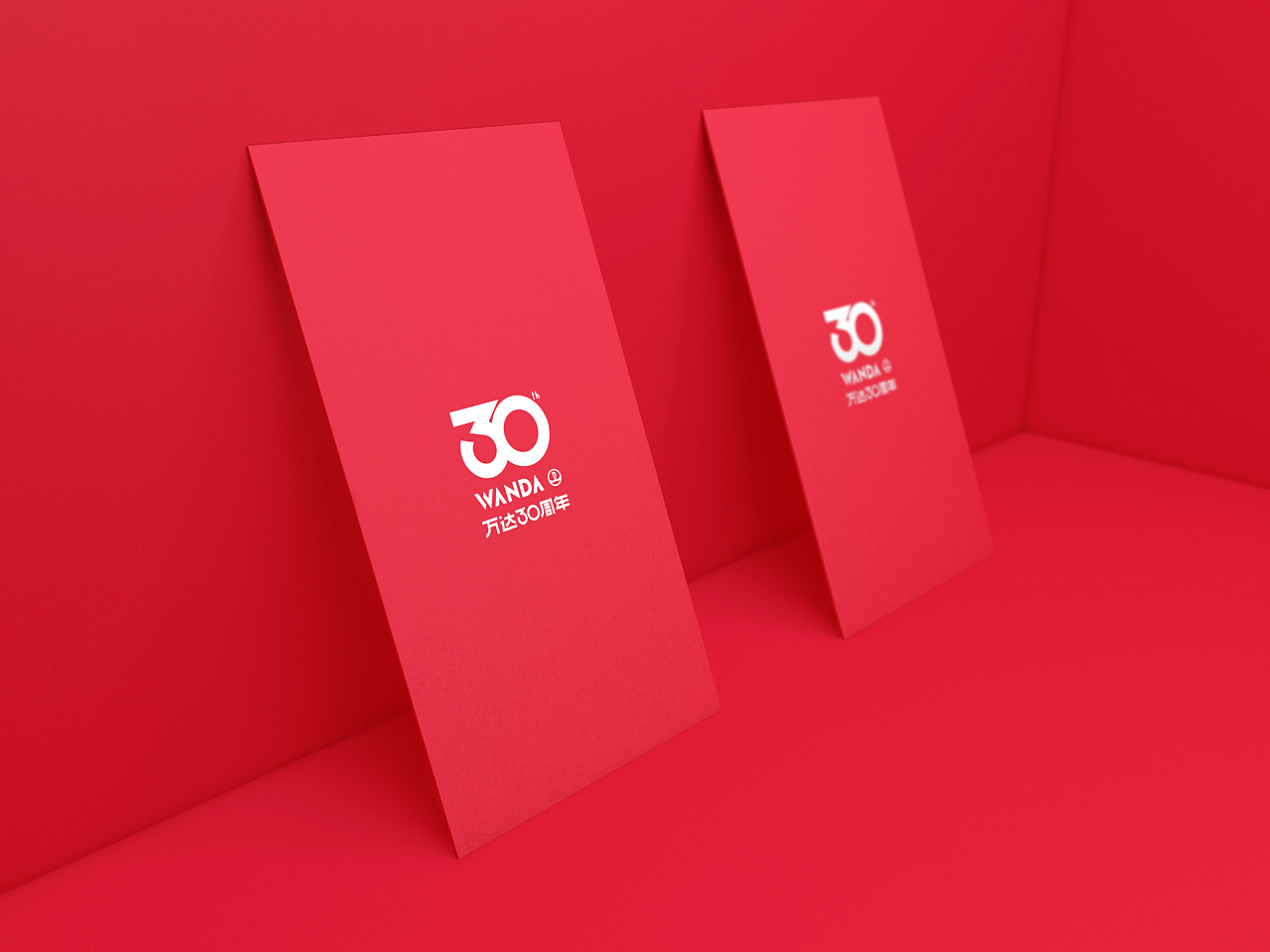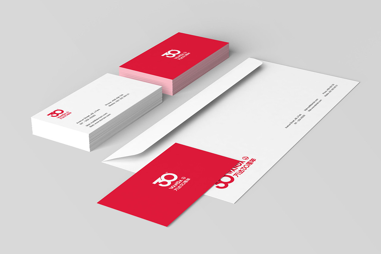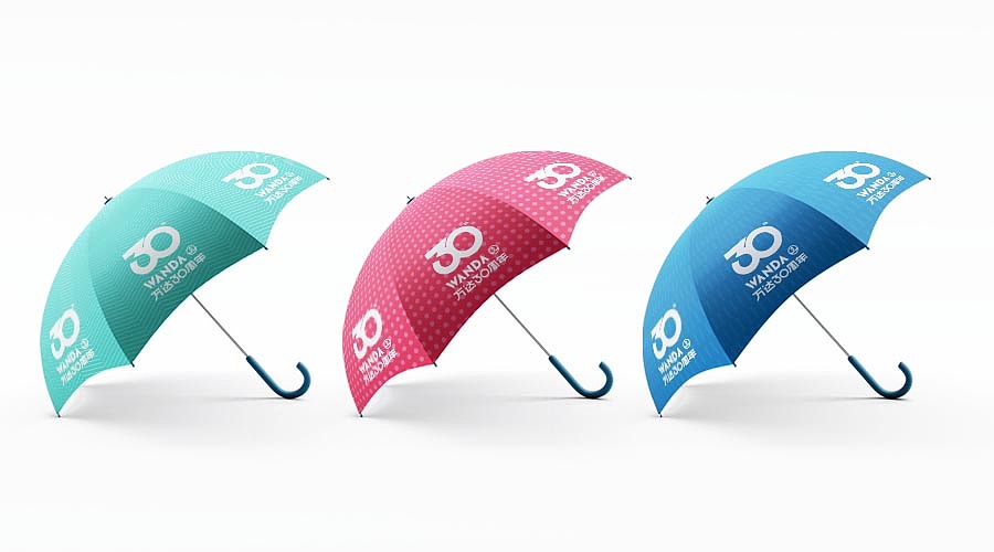 本次主kv顏色定為中國紅,寓意非凡、成就、慶祝;在數字30的字體設計上,我們和WANDA英文的形狀進行了完美統一,體現出氣勢感;同時也設計了名片、信封、雨傘等周邊,體現出分享和喜悅之情;“萬達集團30年風調雨順,輝煌長達,一脈相連,力求望遠世界。”